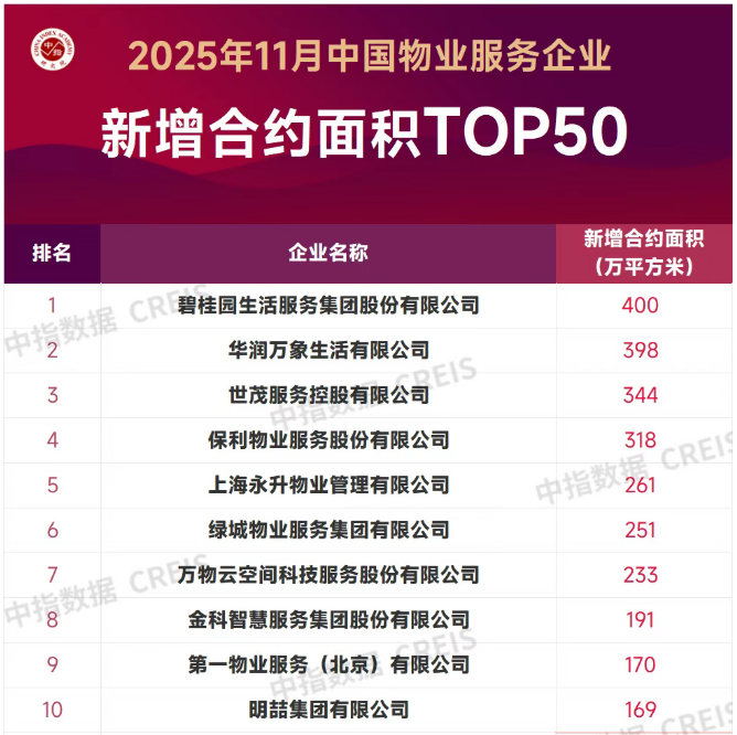 中指研究院最新发布的《2025年11月中国物业服务企业新增合约面积TOP50》显示,11月,TOP50物业服务企业新增合约面积约4975万平方米,头部企业规模持续扩张。其中,碧桂园生活服务集团股份有限公司、华润万象生活有限公司、世茂服务控股有限公司规模扩张迅速,新增合约面积分别为400万平方米、398万平方米和344万平方米。